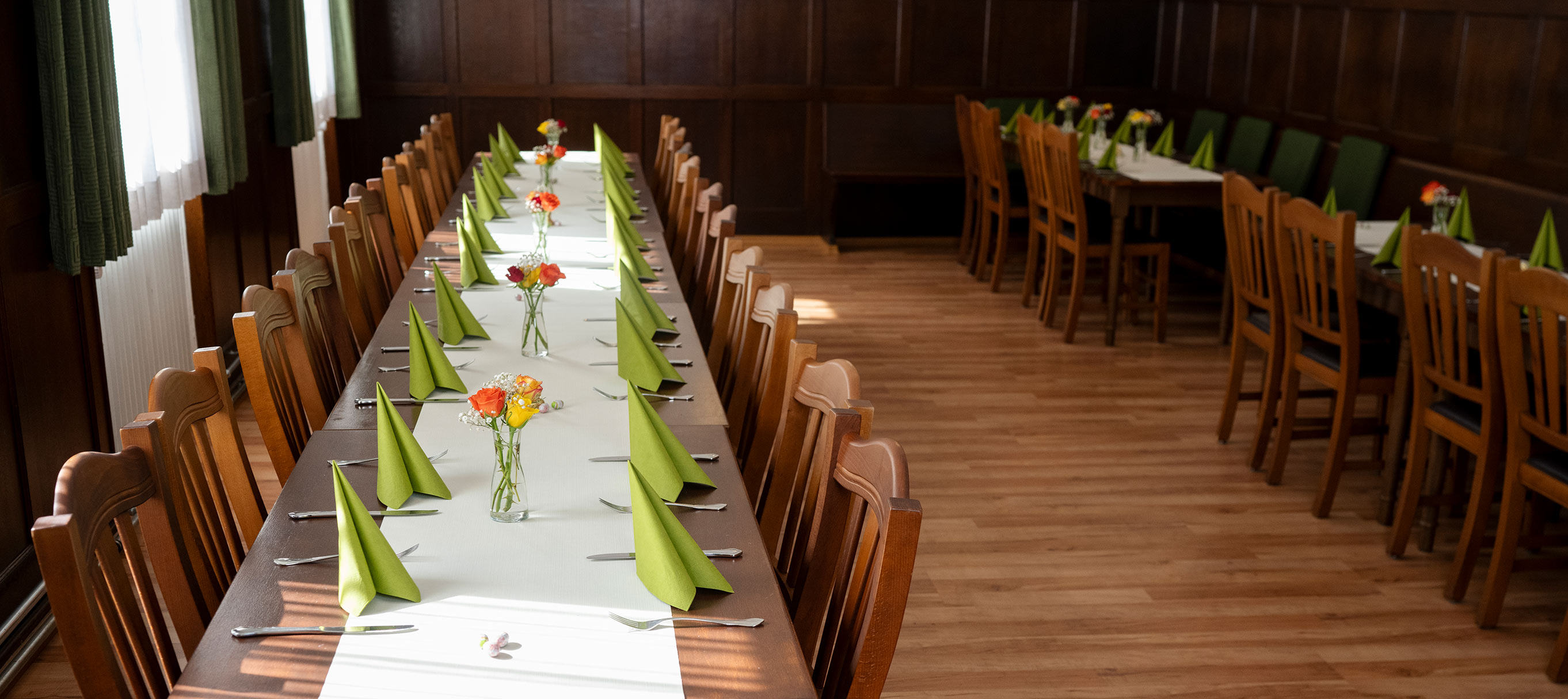 Unser Saal bietet Platz für bis zu 70 Personen, das ganze Wirtshaus für bis zu 120 Gäste.
